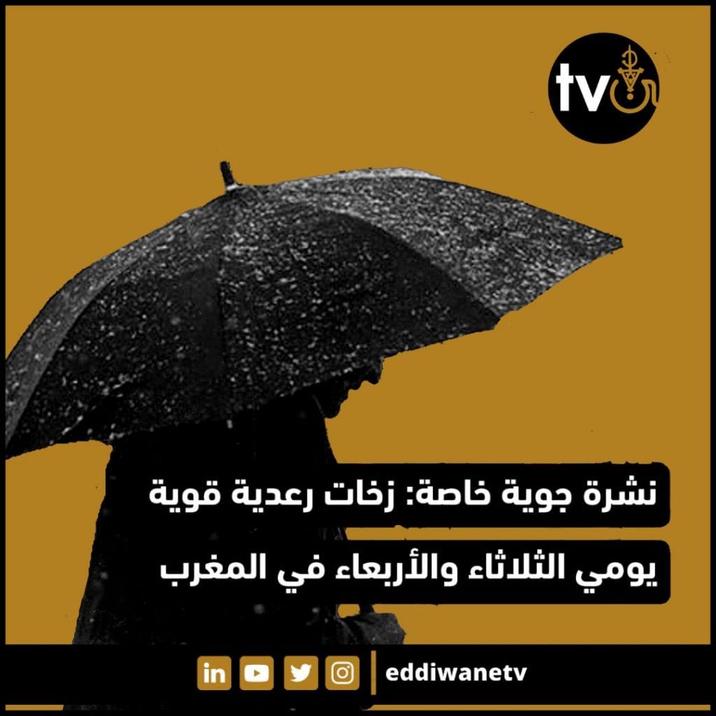 أفادت المديرية العامة للأرصاد الجوية بأنه من المرتقب أن تهم زخات رعدية محليا قوية، يوم غد الثلاثاء وبعد غد الأربعاء، عددا من عمالات وأقاليم المملكة. وأوضحت المديرية، في نشرة إنذارية من مستوى يقظة برتقالي، أن أمطارا رعدية محليا قوية (من 20 إلى 40 ملم) ستهم أقاليم الحوز، وأزيلال، وبني ملال، والرشيدية، وفكيك، وإفران، وميدلت، وتنغير، وذلك ابتداء من يوم غد الثلاثاء على الساعة الثانية عشر زوالا وإلى غاية الساعة السادسة صباحا من يوم الأربعاء. وأضاف المصدر ذاته أن هذه الزخات ستكون مصحوبة محليا بتساقط البرد أو بهبات البرد.