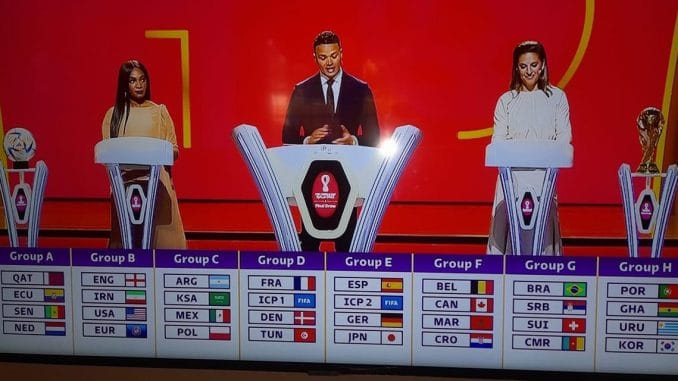 و أسفرت القرعة التي ترأس حفلها الشيخ تميم بن حمد آل ثاني أمير دولة قطر الى جانب رئيس الاتحاد الدولي لكرة القدم جيياني أنفانتينو، بحضور ممثلي المنتخبات المتأهلة لخوض نهائيات كأس العالم في كرة القدم قطر 2022 عن المجموعات التالية .