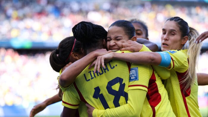 مهاجمة كولومبيا ليندا كايسيدو (وسط) تحتفل مع زميلاتها بهدفها ضد كوريا الجنوبية ضمن دور المجموعات لكأس العالم للسيدات في كرة القدم على ملعب "سيدني فوتبول ستاديوم" في أستراليا في 25 يوليو 2023