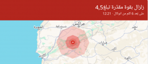 سجلت مراكز الرصد الزلزالي العالمية، اليوم الثلاثاء، هزة أرضية بقوة 4.5 درجات على مقياس ريختر، مركزها على بعد 6 كيلوميتر من جماعة أنوكال بإقليم الحوز.