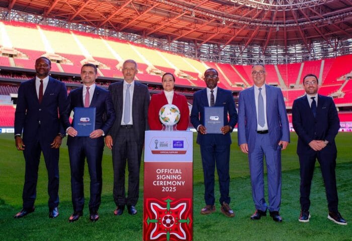 وحسب المصدر ذاته، أقيمت مراسيم توقيع هذه الشراكة يوم 25 من شتنبر 2025 بالمركب الرياضي الأمير مولاي عبد الله بالرباط، بحضور عدد من الشخصيات المهمة، على رأسهم السيد فوزي لقجع، رئيس الجامعة الملكية المغربية لكرة القدم ونائب رئيس الكنفدرالية الإفريقية لكرة القدم؛ والسيد محمد حسن بنصالح، رئيس مجموعة هولماركوم؛ والسيدة مريم بنصالح شقرون، نائبة الرئيس والمديرة العامة لشركة المياه المعدنية بأولماس؛ والسيد فيرون موسينغو-أومبا، الكاتب العام للكنفدرالية الإفريقية لكرة القدم، إضافة إلى حضور شخصيات وازنة من مؤسسات اقتصادية ورياضية وإعلامية.