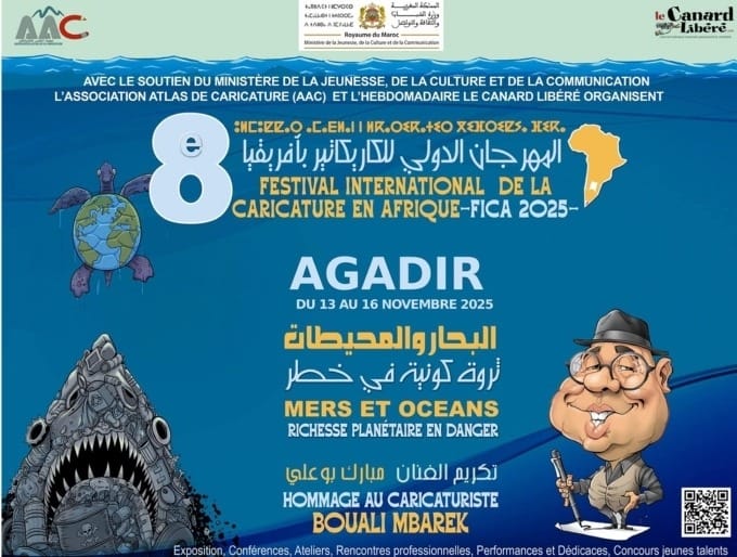 تستعد مدينة أكادير لاحتضان فعاليات الدورة الثامنة للمهرجان الدولي للكاريكاتير بإفريقيا (فيكا)، التي تقام بدعم من وزارة الشباب والثقافة والتواصل، والمنظمة من طرف جمعية أطلس للكاريكاتير (AAC) وأسبوعية « لوكنار ليبيري »، وذلك في الفترة الممتدة من 13 إلى 16 نوفمبر الجاري.